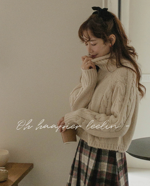 [볼드한 케이블 짜임 터틀넥 니트] [트렌디한 크롭 기장감] [도톰한 두께감으로 포근한 무드] [넥라인이 돌돌~ 귀여운 포인트]