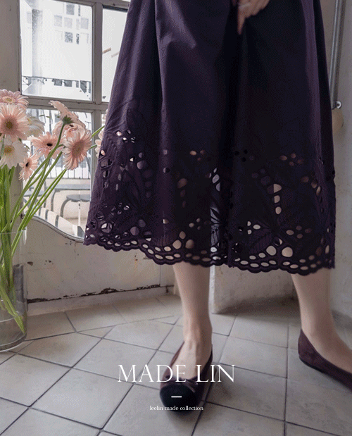 [안감: 폴리][허리뒷부분 밴드처리][버튼 여닫이 가능][허리아래 은은한 주름잡아 매력적인 디자인][스커트 아래 부분에는 펀칭 잎자수로 러블리한 포인트로 구성][사랑스러운 엣지핏의 코디좋은 스커트로 강추]