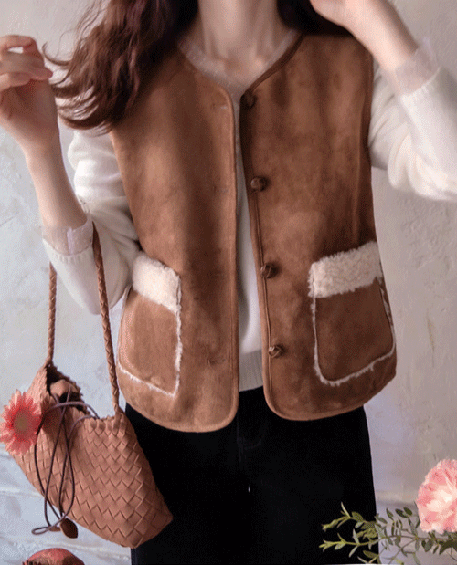 [따숨안감 스웨이드 베스트][퀼리티 좋아요][포켓이 있는 심플디자인의 따숨 베스트][안감은 부드러운 몽땅퍼][귀요미 스타일링을 만들어줄 무스탕베스트][포근하고 따스해요][부드러운 촉감의 세련된 스웨이드 무스탕]