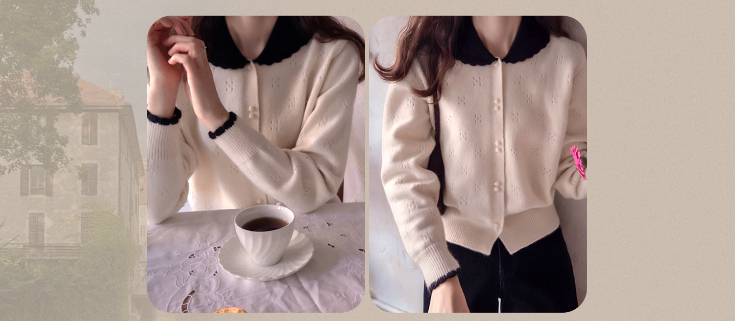 [울 함유된 소재][카라가 너무 사랑스러워요][화사한 컬러감을 형성하면서 기모원단으로 돌아오는 시즌내내 너무 좋아요][기모 레이스 원단으로 여성스러우면서 단아한 무드를 형성했어요][숄더 샤링도 이뻐요][부해 보임 없이 귀엽고 사랑스러운 핏]
