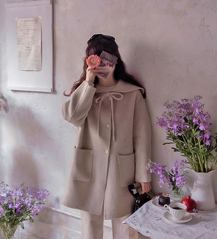 - [양모100% 함유의 브랜드퀄리티의 핸드메이드 코트로 한파까지 따스하게][넥끈 리본묶어 러블리한 무드형성][베이직한 컬러감으로 세련된 코디를 만들어 드릴거예요][세라카라를 구성하여 생동감을 주는 디자인][엣지핏으로 맵시있게 입기 좋은 양모코트로 강추]