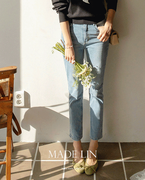 [리린에서 만들어서 퀄리티 UP! MADE.LIN 슬림 일자핏 데님♡] [스판 3% 쫀득한 신축성으로 안 입은 듯 편한 착용감] [밑단 5CM 위 바텍 디테일로 셀프 수선 OK!]] [원단에 더해진 세로슬랍결로 더욱 늘씬해보이는 핏]