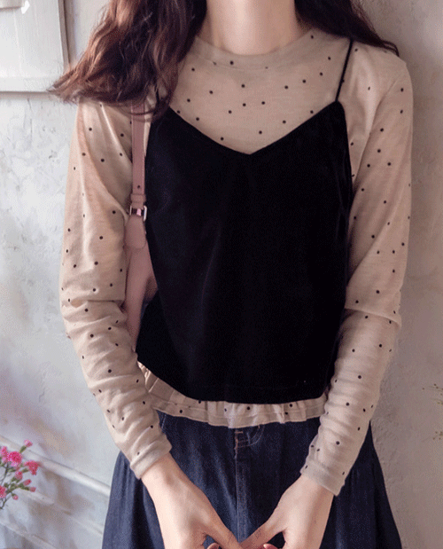 [벨벳탑 + 티 세트예요][돌아오는 시즌까지 너무 좋은 러블리 세트][티는 도트로 포인트하면서 아랫단 샤링으로 사랑스런 무드형성][세련된 컬러감의 시즌어블한 아이템][티와 벨벳탑 세트로 활용도 높은 아이템][러블리 귀요미 세트로 강추]