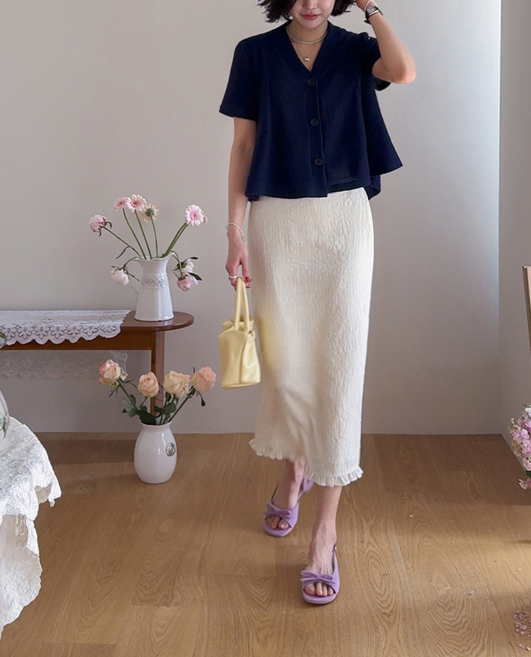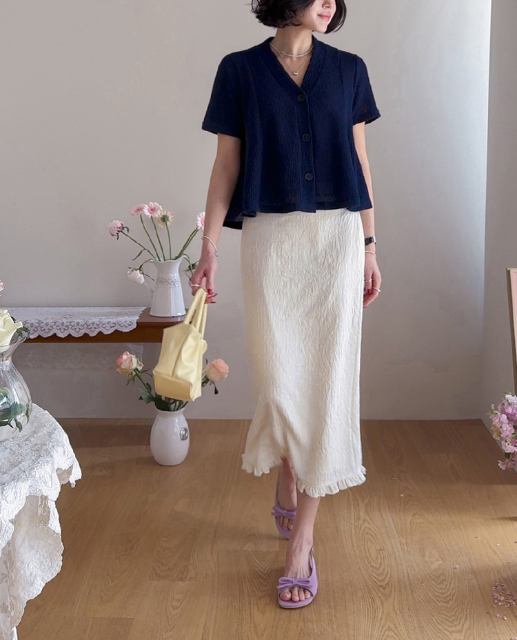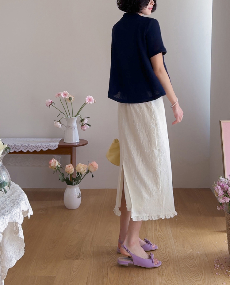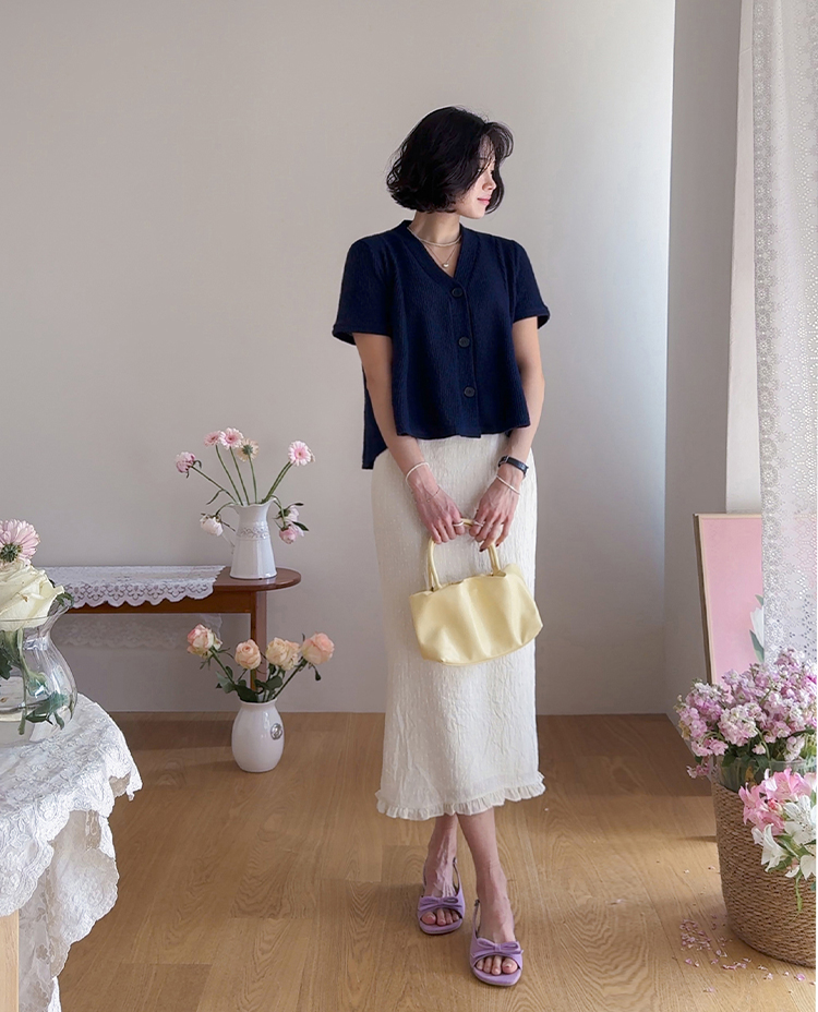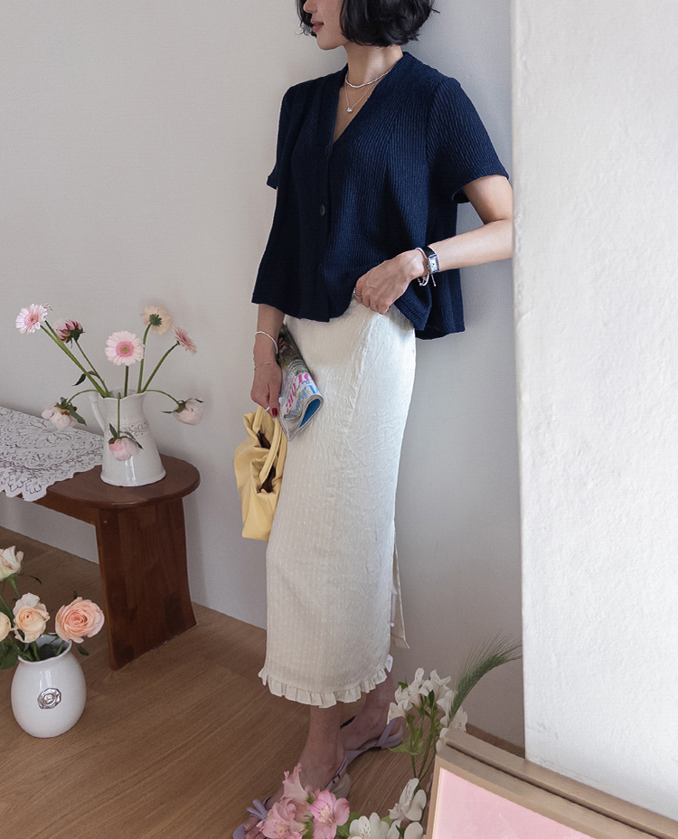 아래는 살짝 퍼지며 여성스럽고 경쾌한 핏을 만들어줘요.