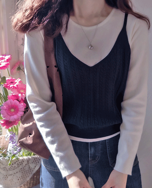 [니트티+ 니트 뷔스트에 세트예요][니트티는 울 비스코스 함유의 부드러운 신축성의 편안한 착용감][니트티와 뷔스티에 세트로 활용도 높은 아이템][은은한 꽈배기 패턴의 뷔스티에와 니트 티 세트로 너무 이뻐요][따스미 세트로 강추]
