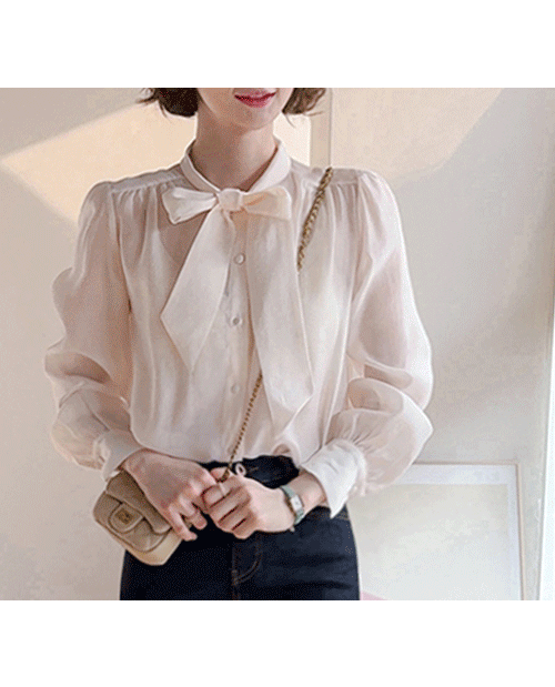 [LABEL] 루디나 리본타이 어깨핀턱 뒷셔링 블라우스 [size:F(55~66)]