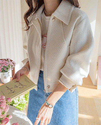 [담백한 트위드 조직감으로 봄까지 쭉~ 입기 좋아요!] [어깨선 자연스럽게 떨어지는 래글런 라인으로 여리핏 연출] [과하지 않은 크롭 기장으로 비율이 예뻐보여요 ㅎㅎ] [단추와 포켓 디테일까지 깔끔하게 정돈된 미니멀 무드]